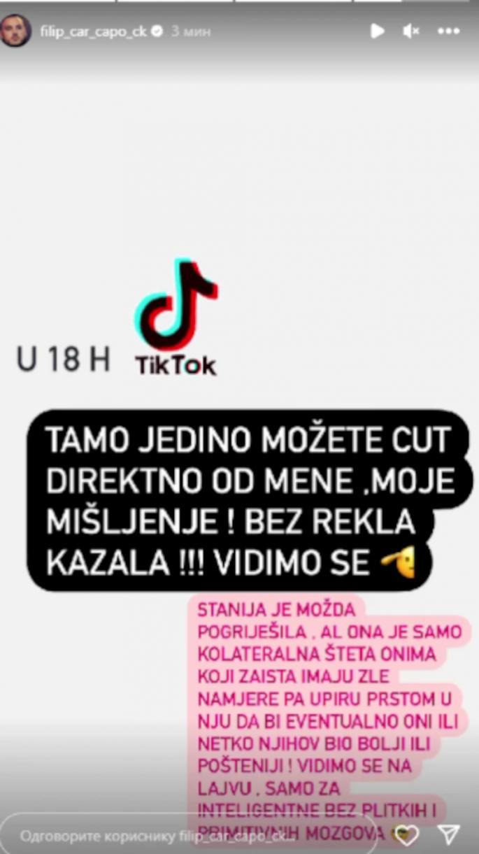 Nakon oglašavanja starlete Stanije Dobrojević, Filip Car se obratio svojim pratiocima na društvenoj mreži Instagram.